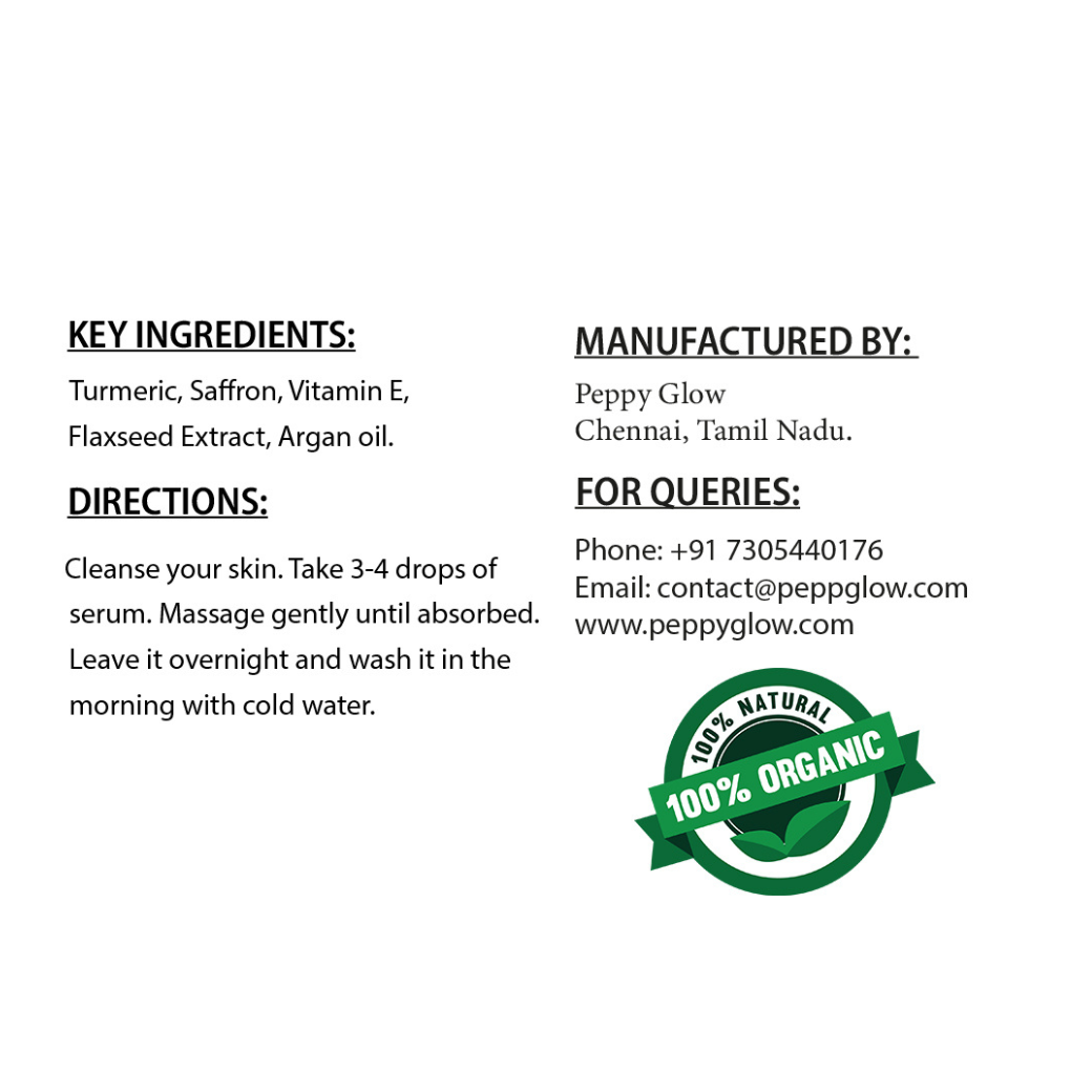 Reveal your skin’s natural glow with PeppyGlow Turmeric & Saffron Serum, a luxurious Ayurvedic blend designed to brighten, nourish, and rejuvenate your skin. Infused with the golden power of Turmeric and the richness of Saffron, this serum helps fade pigmentation, reduce dark spots, and restore an even skin tone. Turmeric’s anti-inflammatory properties calm irritation, while saffron boosts radiance and supports cell renewal. The lightweight, fast-absorbing texture makes it suitable for daily use, leaving your skin soft, hydrated, and glowing without any stickiness. Perfect as a part of your day or night skincare routine.